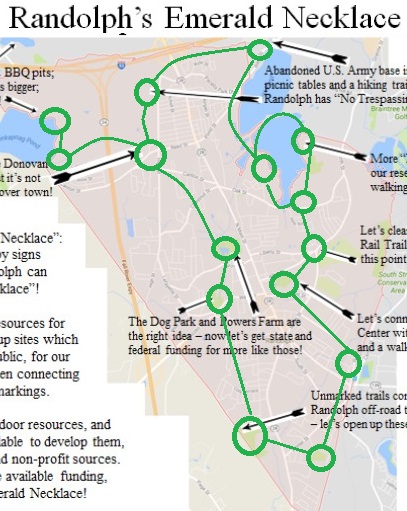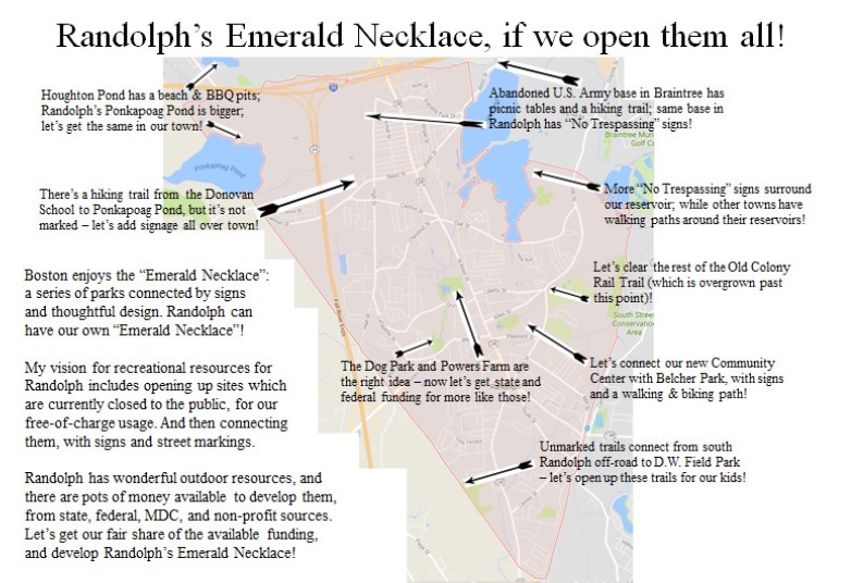 Each park is connected to the next park with a sign saying "Emerald Necklace" -- for example, when you exit the Arnold Arboretum to the north, you can see the sign pointing the way to Jamaica Pond, a half-mile up the road. People are all over every one of the "emeralds" in Boston's emerald necklace -- on foot and on bicycle and in wheelchairs, with their families or on their own -- we can do the same thing in Randolph!