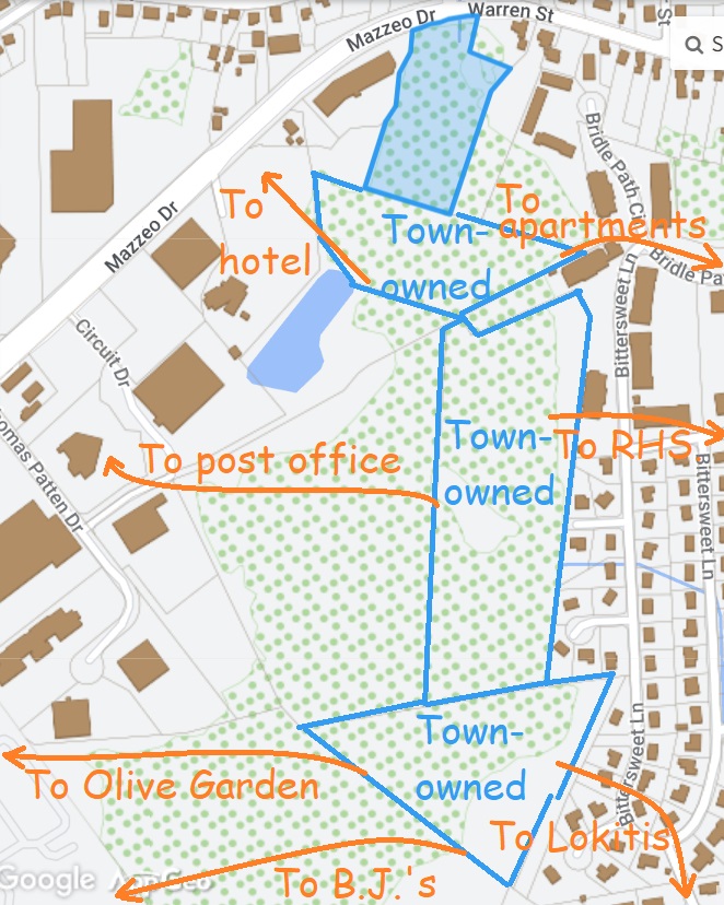 A "greenway" means a pedestrian/bicycle path in a "linear park" where you can walk for several miles mostly off-road (mostly). The Jablonski properties could create a "Randolph Greenway" from Powers Farm to Bear Swamp, with the Dog Park path in between. The Randolph Greenway would cross Grove Street, West Street, and Warren Street or Mazzeo Drive -- about 2.5 miles total.