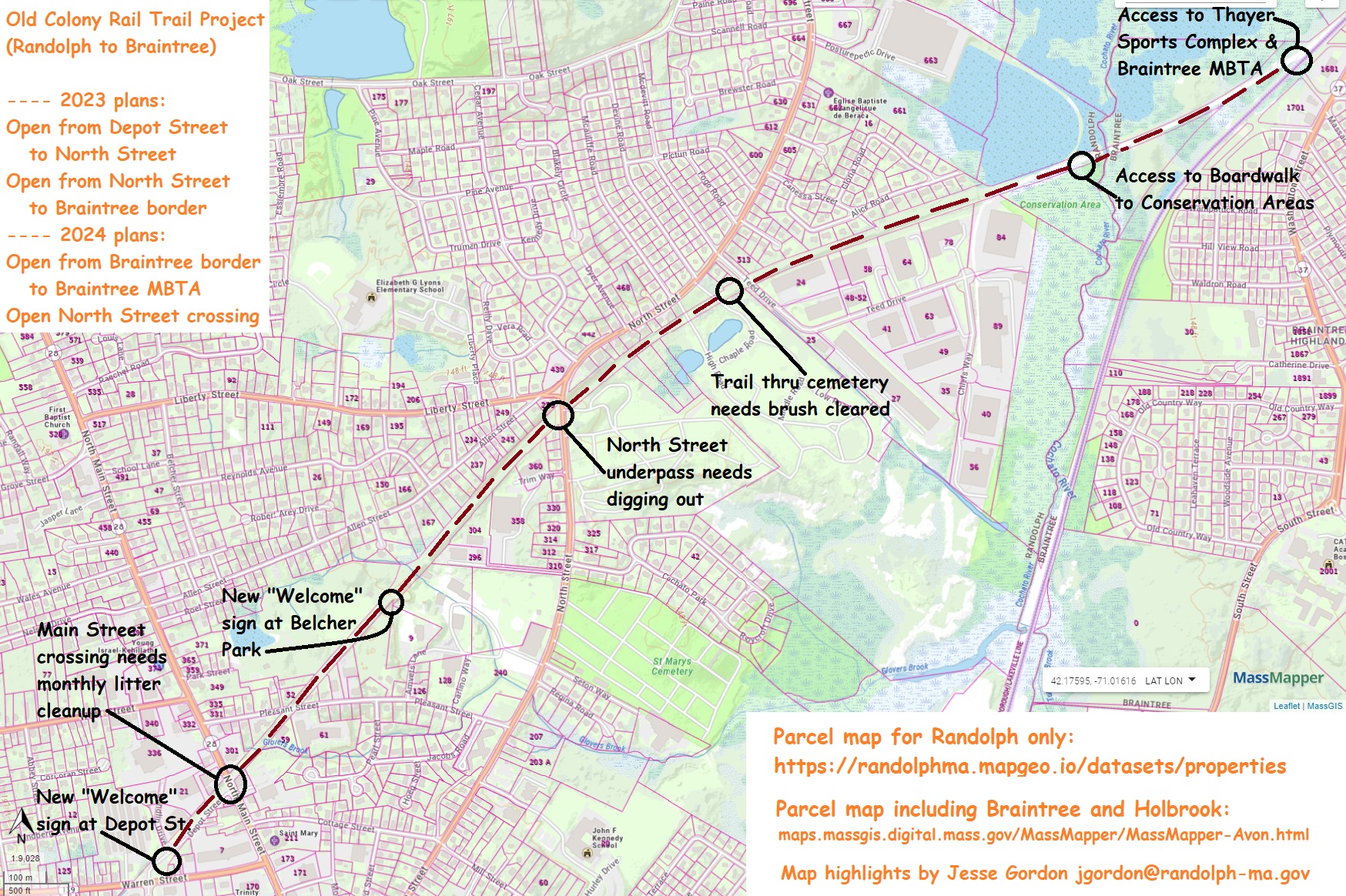 The Randolph Community Wellness Plan #14.4 says "Assess... walkability, and safe bike routes to parks and recreational facilities, and identify improvements that would increase Randolph resident access." The purpose of this project it to increase resident access to the "north half" of the rail trail, which currently has zero access.